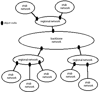 Although the Harvest cache performs exceedingly well as a httpd-accelerator, it is when the cache is used as a node in a heirarchical cache topology that the differences between the Harvest cache and standard caches can be seen. In such a setup, the cache is only one of many caches on a particular network, and the individual caches can be interconnected heirarchically to reflect that network's topology (below). In addition to a parent-child relationship, each cache supports a notion of siblings at the same level who aid in load distribution.