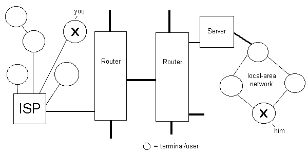 Your computer, say in your home, is connected through the phone line to another larger computer. This computer belongs to your "internet service provider" or "ISP". Their computer is physically connected, using probably a huge wad of fiber-optic cable, to many other large computers (called "routers"), which are in turn connected to other routers. Another user may be connected through a large "server" in his office. In this way, any piece of information can be transferred from one small computer to another, assuming it can find its way from one end to the other.